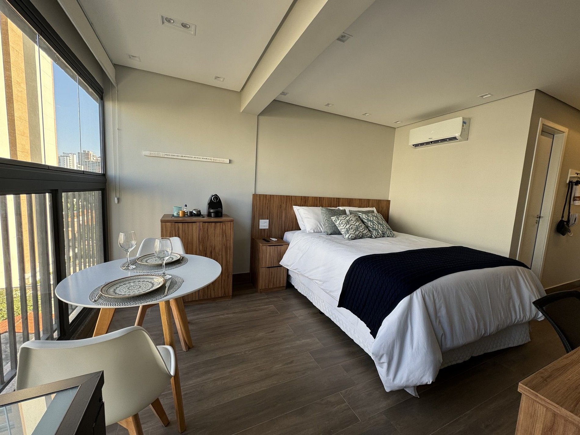Studio de 24 m² com cozinha completa, ar-condicionado, cama queen-size, espaço de trabalho e varanda com área para refeições e uma bela vista para o Parque da Água Branca.